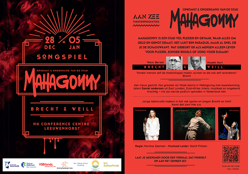 Mahagonny van Bertolt Brecht vertelt het verhaal van een stad waar alles te koop is en geld de machtigste waarde is. Het stuk symboliseert een wereld waarin welvaart wordt verward met welzijn, een belangrijk thema voor iedereen die op zoek is naar geluk, identiteit en zelfexpressie. Dit stuk dat begeleid wordt met muziek van Kurt Weill biedt een unieke combinatie van maatschappijkritiek, menselijke kwetsbaarheid en theatrale kracht, inspiratie, hoop... èn een spiegel.